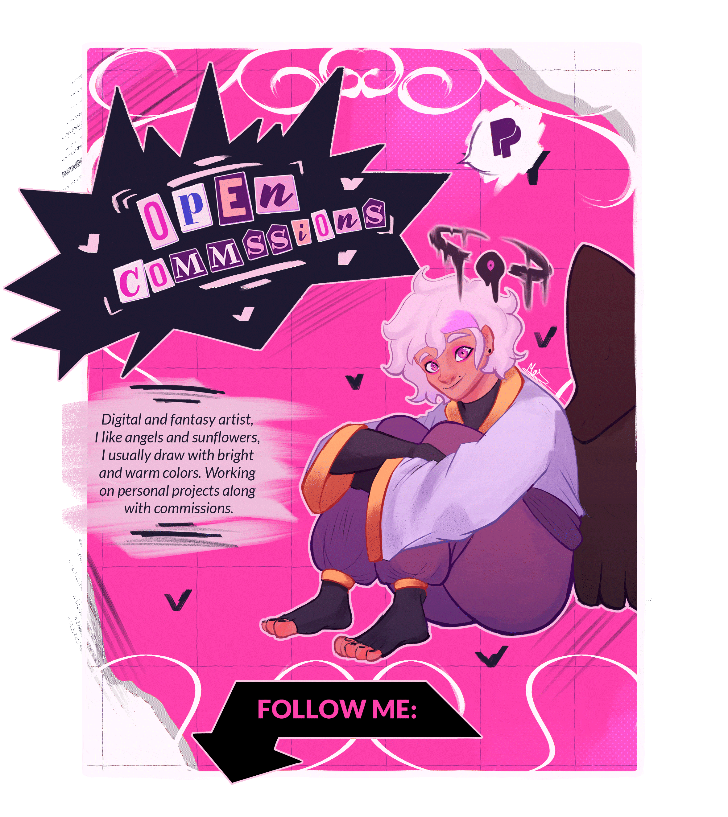 ❥ Please read the terms of service before commissioning.❥ Please attach your social media handle and email for me to reach you easily.❥ Mistakes made on my part will be corrected free of charge, regardless of when I make them.❥Once the commission has been paid, there are no refunds.❥Please provide me with as many references as possible so that I can have a better idea of what you would like me to do for you.❥My current or future work WILL NOT be used to implement it in an AI or anything related, please respect my effort.