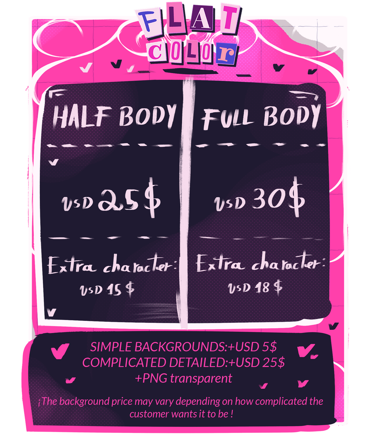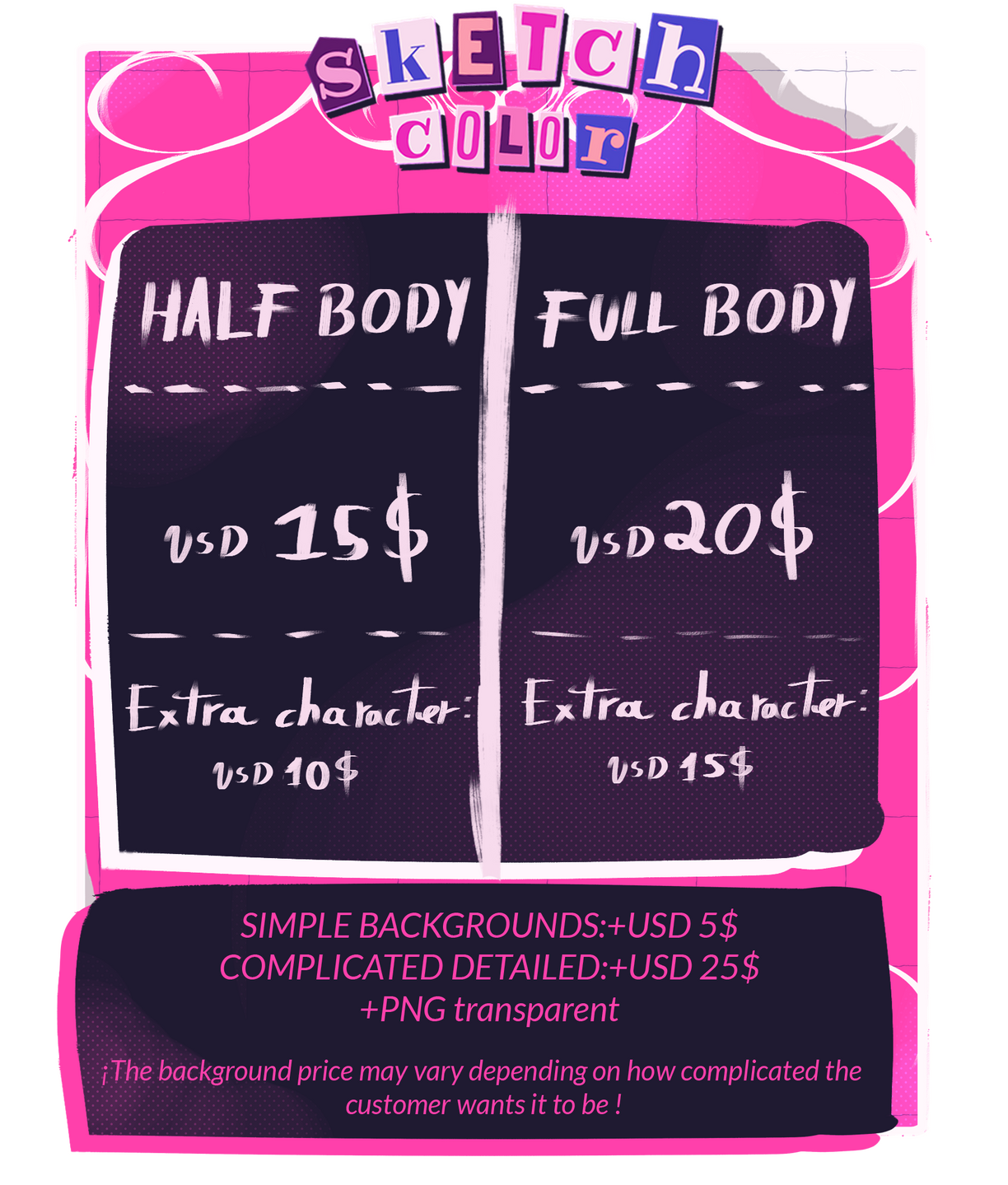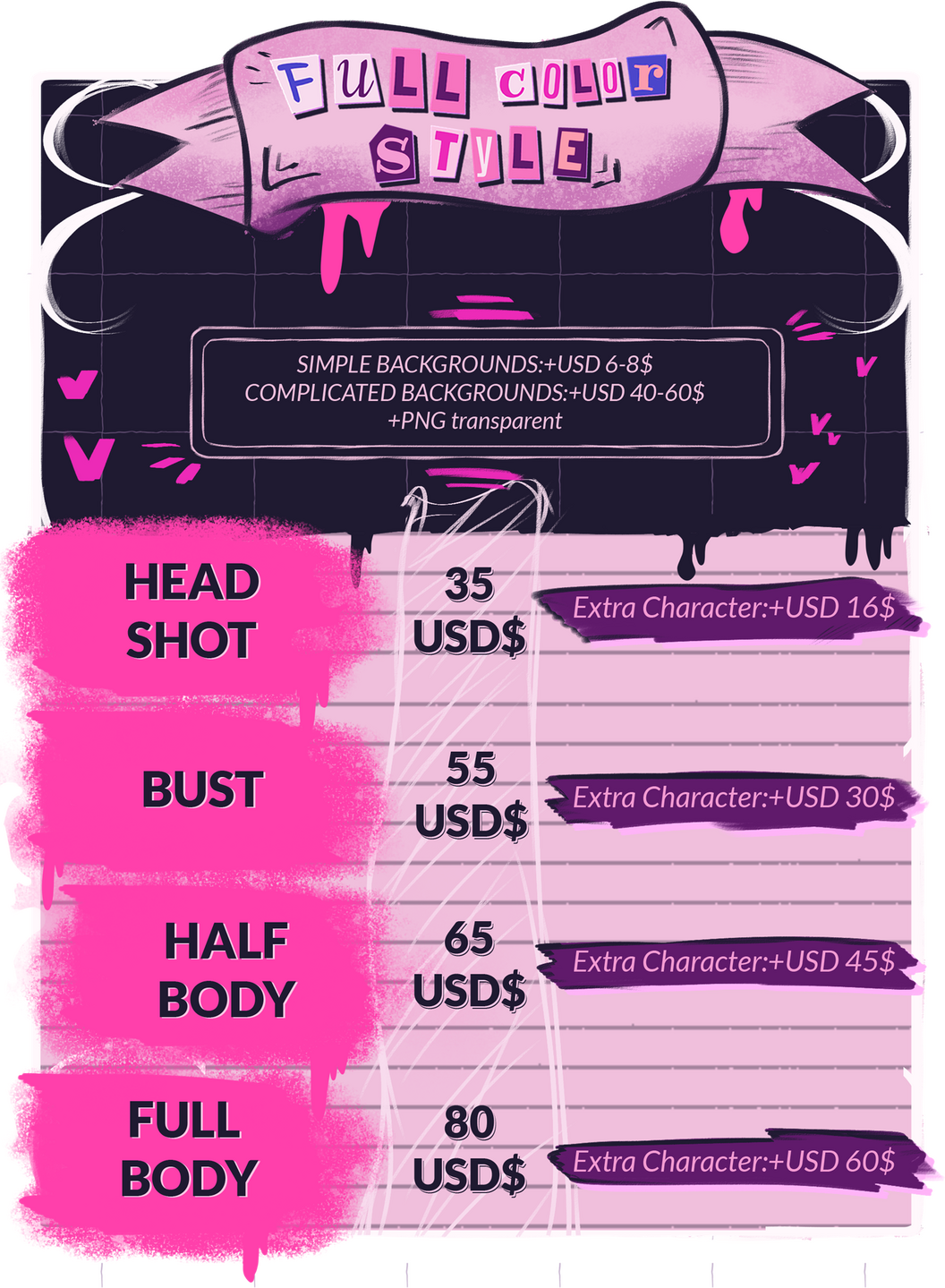 GENERAL❥ Commission takes 1 to 4 weeks to complete(Time may vary depending on the complexity of the commission).❥ Payment is in advance. (PAYMENT METHODS: PayPal, Ko-Fi.)❥ Once you request a commission you will enter an order list ( such list is public and you can see the status of your commission)❥ The commission will be sent to you by email.❥ PLEASE do not spam me asking for updates , I understand you want to see the progress , but DO NOT ask for an update every Day or every other day ; your commission is not the only one I am making , so it will not be finished in a day or two.❥Be sure you got the money before doing the payment.❥ If the assignment is too complicated or does not suit my artistic style, I will reject it.❥The relationship between the Artist and the client is PROFESSIONAL❥The prices above are the default per character, if the character design is too difficult or too simple, or there is more than one character the price may change.❥I can post the completed work online as my portfolio. (please let me know if you prefer not to have your commission posted online. I will respect your boundaries)